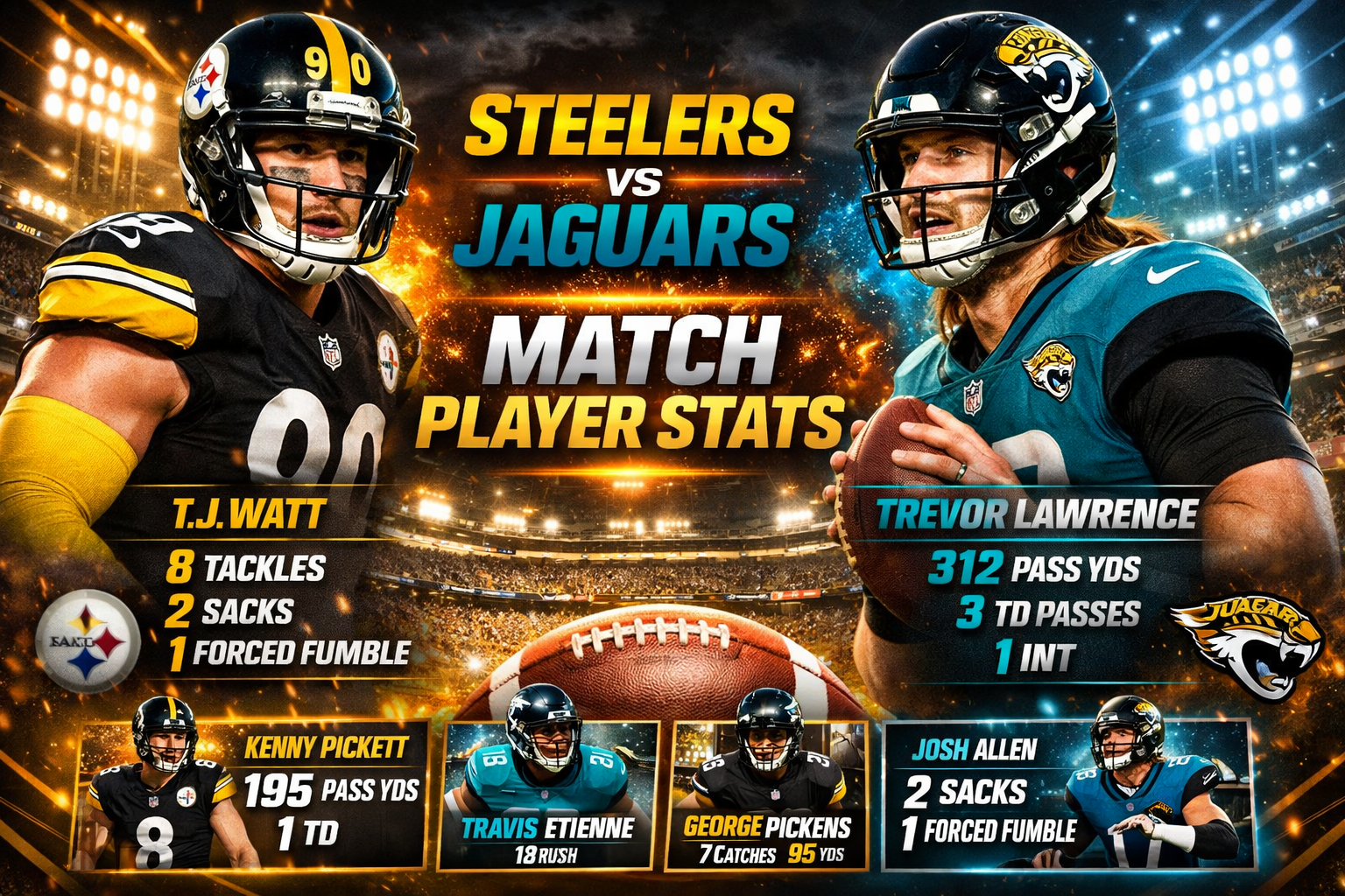3. Which defensive stat is most important in this matchup? “Turnover Differential” is the most decisive factor. In the pittsburgh steelers vs jacksonville jaguars match player stats, the team that wins the turnover battle by two or more has won nearly 90% of the games in the last decade. Sack totals are also a major indicator of who is controlling the flow of the game.